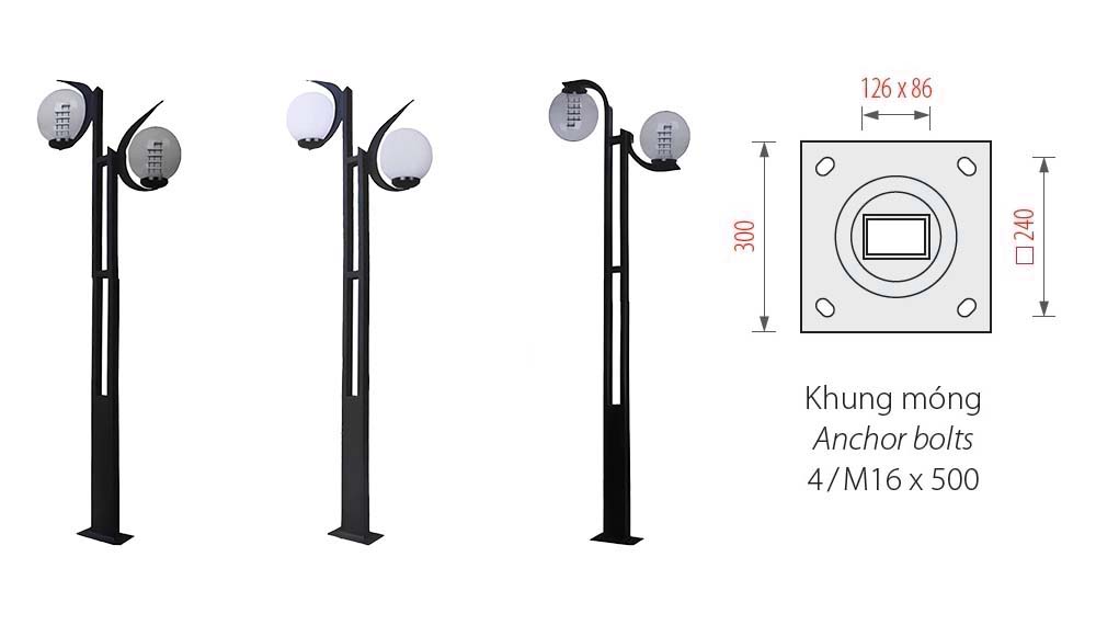 Cột đèn có thể lắp đặt với nhiều loại tay chùm và bóng đèn khác nhau.