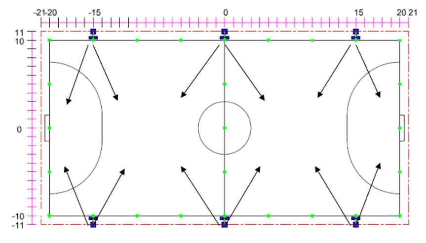 Chi tiết cách bố trí đèn LED chiếu sáng sân bóng mini 7 người theo sơ đồ dưới đây: