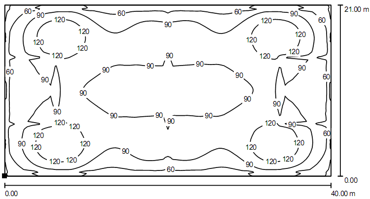 Bố trí đèn sân bóng đá 40 x 60: Bố trí 12 đèn trên 6 cột 2 bên sân.
